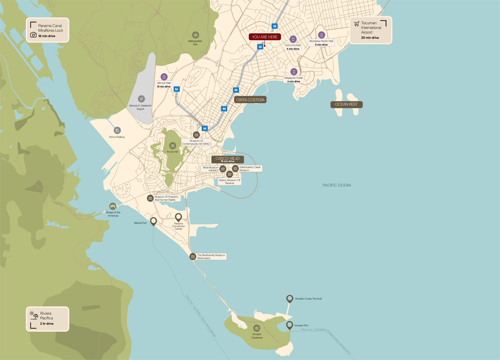 Nhờ vị trí trung tâm, dự án cho phép tiếp cận nhanh chóng đến các trục giao thông chính, sân bay quốc tế Tocumen và các khu vực ven biển, đồng thời nằm trong mạng lưới kết nối toàn cầu của Panama – cửa ngõ giao thương quan trọng giữa Bắc và Nam Mỹ. Khu vực xung quanh tập trung hệ thống tiện ích đa dạng như trung tâm kinh doanh, khu mua sắm, nhà hàng, khách sạn quốc tế và các điểm giải trí cao cấp, tạo nên môi trường sống và đầu tư năng động.